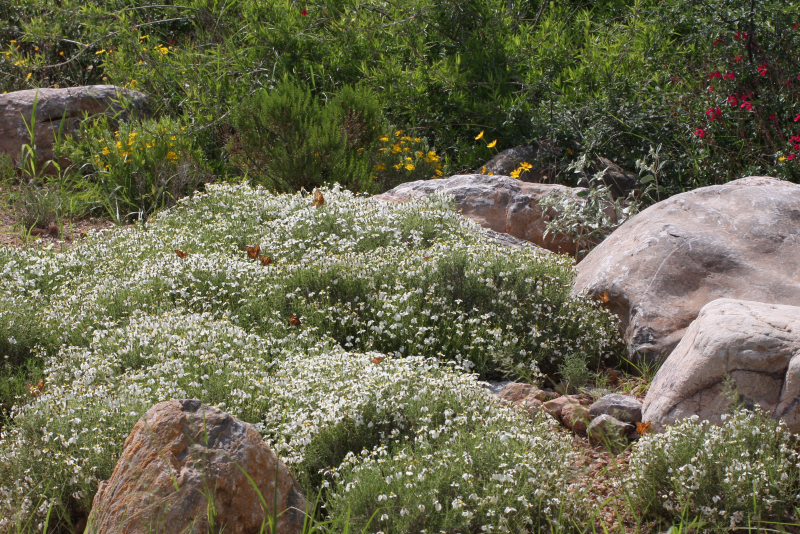 Appearing nearly identical to Zinnia acerosa, Melampodium leucanthum (blackfoot daisy) was much easier to grow and easier to obtain seed. I introduced seed to the boulder garden and the plants grew well, even surviving the fire.