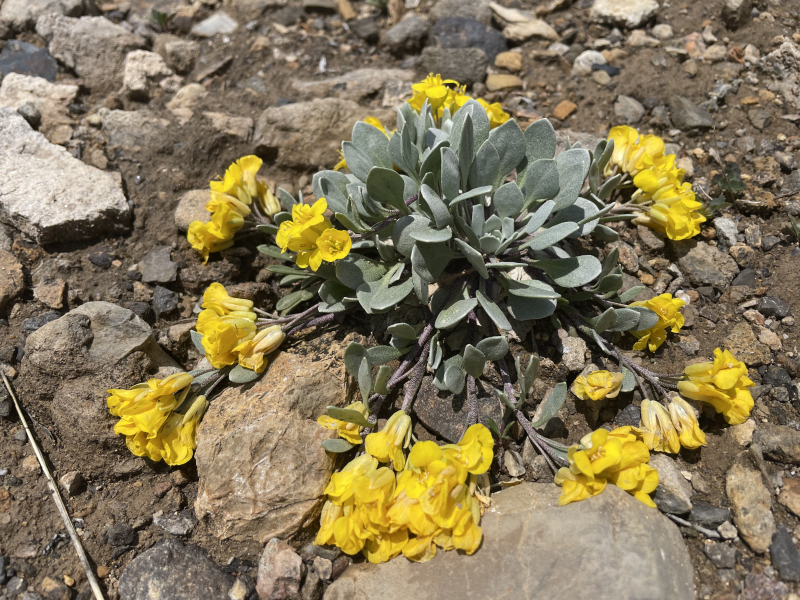 Physaria alpina: The Brassicaceae, or mustard family, is high up there for numbers of endemic plants in cold, high places. Physaria alpina is one of the most attractive members of a genuinely attractive genus. Bright yellow to almost orange flowers surround a silvery rosette of leaves. It has been cultivated in Denver, Vail, and Steamboat Springs. The genus is found in North America, South America, and far eastern Asia.