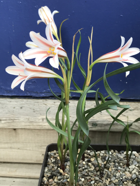 The greenhouse faces south to collect the most light possible, particularly during the winter. I have a bit of whitewash over the polycarbonate panels to provide some shade. In the summer months, when many of my plants are dormant, I take some of them out of the greenhouse and place them on my stairs as well as amongst the troughs and other containers in the garden. The smaller pots tend to stay in the greenhouse. Because I have the whitewash it gives slight shade but still enough sun to ripen the bulbs. Most of my bulbs require a hot summer dry baking which I provide by ferrying them back into the greenhouse or garage when it rains. This can be tedious but necessary to keep them dry. For soil I use a well-drained mix of compost, grit, and coarse sand equal parts, sometimes making tweaks by adding pumice depending on the species grown. I fertilize with tomato fertilizer as I find this to be an excellent bulb fertilizer.