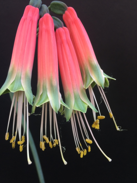 Moving away from southern Africa we have Scadoxus cyrtanthiflorus. This beautiful and highly sought-after species is endemic to the Rwenzori Mountains of Uganda and the Democratic Republic of the Congo. Its long green-and-red tubular flowers resemble some species in the genus Cyrtanthus, hence its specific epithet. It blooms in early autumn.