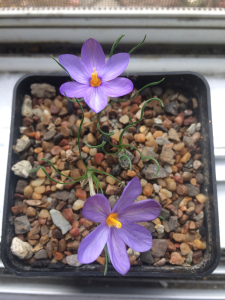 The genus Iris has a special fond spot in my heart, particularly those from section Oncocyclus due to their large flower to leaf-size ratio, mesmerizing colors and patterns. Iris kirkwoodiae has heavily marked falls and a chocolate colored signal patch. This species comes from Turkey and Syria and flowers in late May. Iris paradoxa forma choschab is a unique form from eastern Anatolia and northwestern Iran with small blackish purple falls, a brown beard, and exquisite purple venation. Iris acutiloba subsp. lineolata comes from Turkey, Iran, and parts of central Asia and blooms in early June. Iris nicolai from central Asia is a Juno and is considered a color form of Iris rosenbachiana. It blooms in January and has deep violet falls with a bright orange crest.