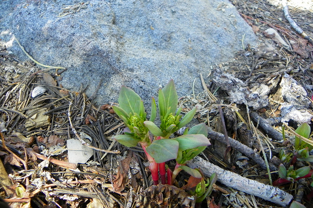 I photographed these new shoots emerging at the base of a clump of Whitebark pine(Pinus albicaulis). The location is Alpine County, CA, USA. On the trail from Carson Pass to Winnemucca Lake. We had just passed Frog Lake the elevation was in the region of 8600' (2 621m). I feel it may be a hemiparasitic species due to it's late emergence. This plant was just emerging in late July.
