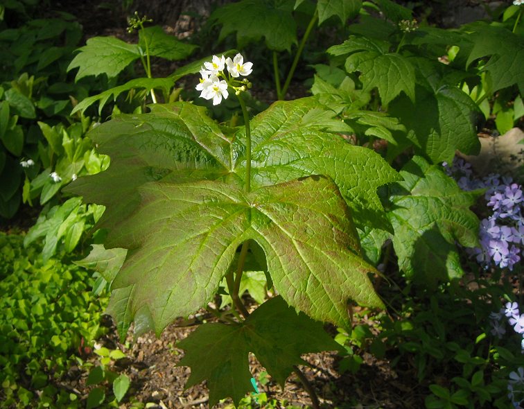 This plant has been very slow to establish, taking a decade to bulk up into a fine clump, probably because I have it in somewhat dry shade, when the plant prefers more moist conditions. But it never fails to provide a long season of foliar interest, if not amusingly so, as the leaves are indeed like crinkly brown umbrellas when they first emerge, the brown and green mottling lasting for weeks as the leaves expand. The single leaves are large, and reminiscent of Jeffersonia (Twin Leaf) with the mass of each leaf divided into two opposing sides, like big crazy neckties.
