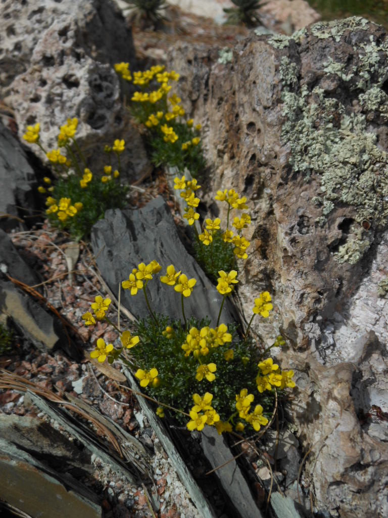 Draba1; seed collected on one of the more "spare" boulders in a Bighorn Mountain meadow in 2009. It is always tiny and has needle-like leaves. Seed was sown on one of my "scattertroughs!" -no bother about actually trying to grow it which doesn't always work anyway.