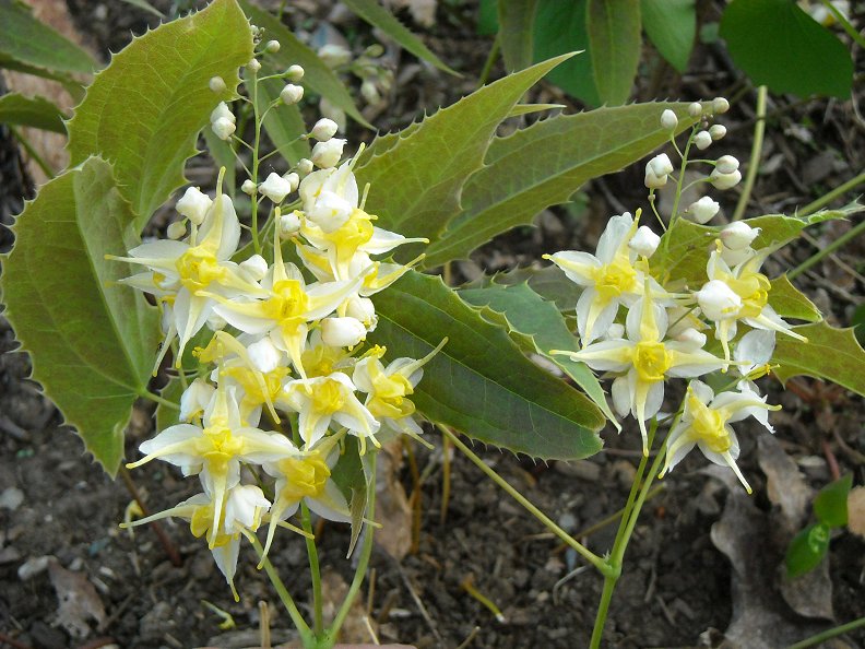 Let me start with a single recent species, E. wushanense, a species of only recent and rare obtainability, an imposing tall species with large creamy white flowers. Epimedium wushanense "Spiny-leaved Forms" is a selection from several clones grown by Darrell, growing much lower and leafier, with shorter condensed panicles of large bloom. I got my plant at a local NARGS auction 3 years back, where Darrell as usual generously donated a wonderful selection of "choicest of choice" epimedium to benefit our chapter.