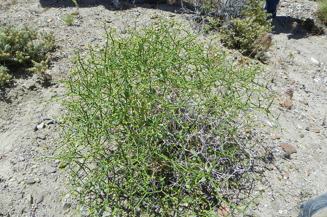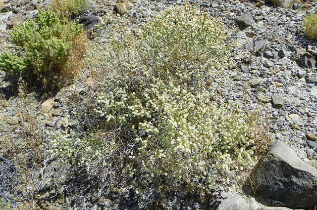 Eriogonum heermannii var. humilius is a domed airy shrub of the sagebrush and saltbrush comunities in the Great Basin. Found growing in the moderatly deep sandy deposites of arroyas and drainages.The bright green stems are heavily branched at all the nodes and the few leaves it has, are located on the lower branches. They drop off early in the heat of summer giving it a stark skeletal appearance. From a distance it looks like a thorny desert dweller. When you give it a closer inspection you realize that it is not armed with spines, just stiff tapered twigs. The plants I have seen are from 12-30 inches tall and as wide as they are tall. They bloom in July opening most of the flowers in a week long flush. As the flowers ripen their seed the flower heads turn a copper color as they desiccate. A dramatic shrub no matter the season.