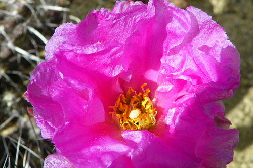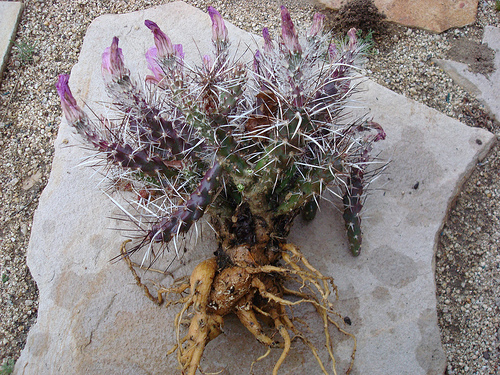 Here we have one of the little understood members of the tribe Opuntia. Grusonia pulchella's range is from the eastern edge of the Sierras in California across central Nevada into the western counties of Utah. It is found growing in sandy dry habitats around the shore lines of playas, dry drainage channels, and sandy slopes. G. pulchella produces a large tuberous roots that store reserves of moisture.It grows in areas that receive about six inches of moisture per year.
