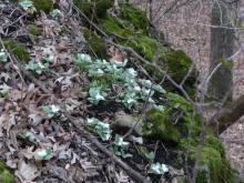 The preferred habitat for the Snow trillium here is at the edge. The best examples are always the most difficult to view close up. A patch of Trillium nivale is at the top left of each photo.