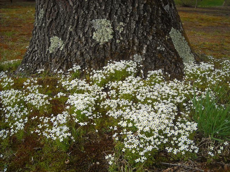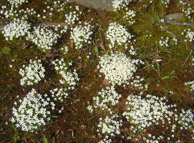 But I have seen specimens that dazzle the eye and spark the imagination, a rock gardener's dream to be sure. Typically such spectacular plants, as I have spotted them, are growing in moist locations in neighborhood lawns amongst lush, deep green spring grass, where trespasser's shall not venture, but the eye strains for glimpses of 6" round domed mounds of pristine white, as if imitating Aretian Androsace, at least from afar, but merely growing in someone's lawn! The prospect so close, yet unreachable. I imagine knocking on someone's door with what would surely seem a bizarre and suspect request to gain access to these magnificent domes of white, for a petite snippet, when they are mere "weeds" in someone's un-mown spring lawn.