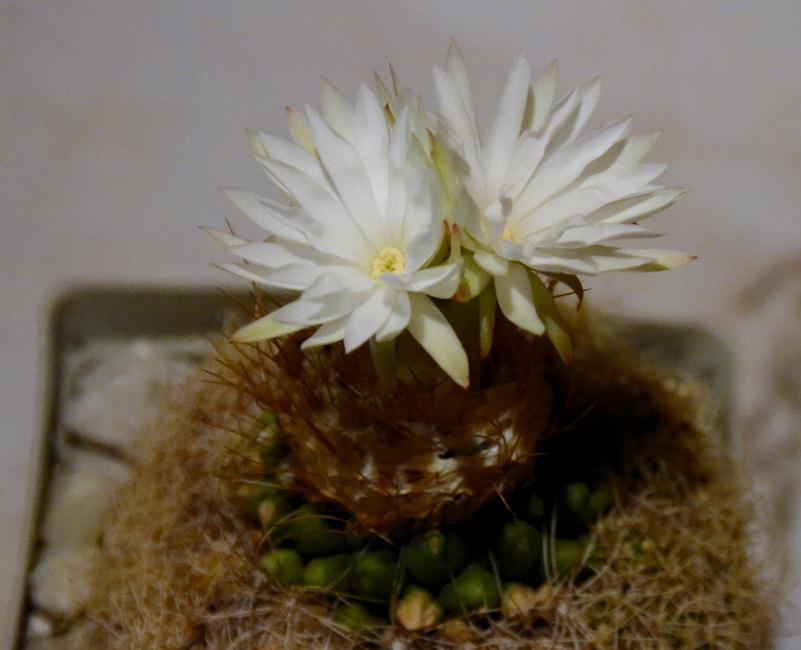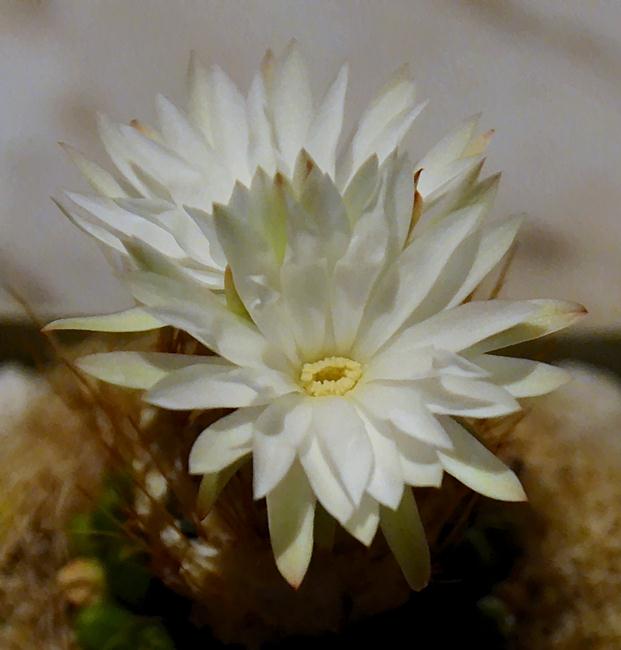 My oldest and still main interest is in cacti and succulents, so I'll start with a plant that flowered last night - this is Discocactus zentneri a cactus from areas of rocky outcrops/quartz deposits in a semi-arid/seasonally dry part of Brasil. Plants in this genus form a cephalium- a sort of dense wooly growth on top of the main vegetative body- once they reach maturity, and after that the main body does not get much if at all larger, just produces offsets and flowers. Because of the cephalium, early bud development is hidden, and the bids suddenly appear in the daytime, reaching maturity and flowering overnight, for just one night! My plant does not seem to be notably scented, though some are, and flowers open at /after dusk (depending on season here) and close before dawn, so I can only take flash pictures or in ambient light (no photo light set-up currently) meaning they are usually kind of crappy shots...lol It flowers for me usually a couple or several times a year from spring through fall, and gets no water over winter..