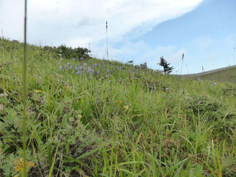 Forgetmenot Ridge in Kananaskis P. P. was finally accessible, via a one-lane temporary bridge on the highway (after the main bridge was destroyed in the late June flood). The bloom was mostly done on the ridge, but there were still some interesting sights, especially up on the conglomerate headlands...