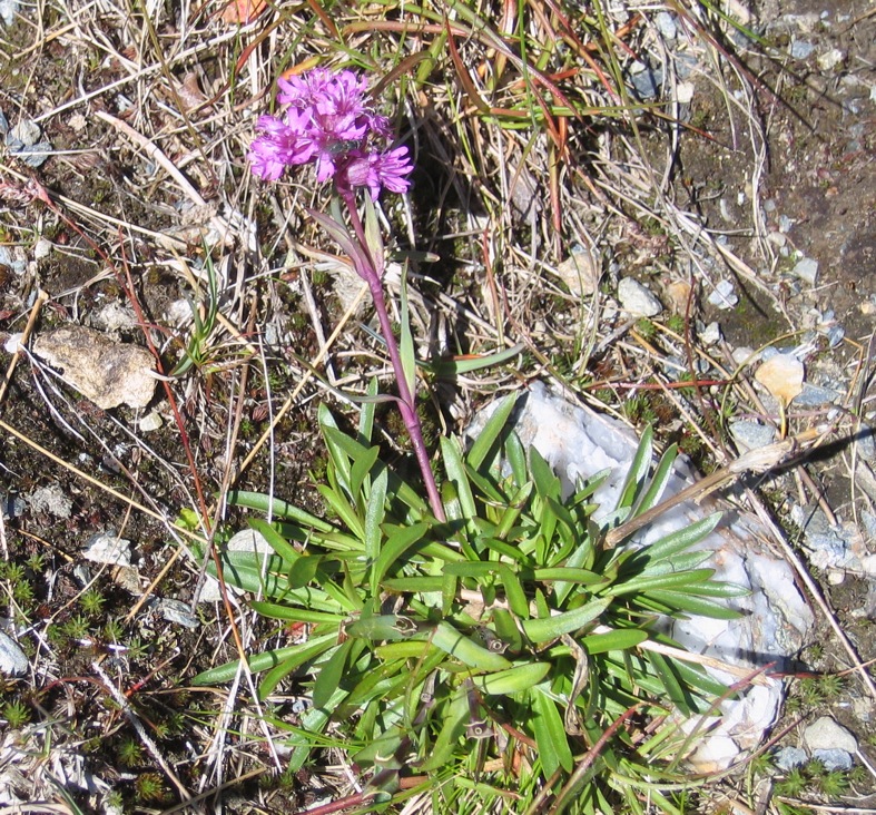 This plant, "fjelltjæreblom" (Lychnis alpina) you can find in the mountains where the soil contains heavy elements like copper.
