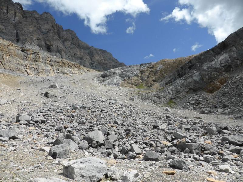 And, after a rather airy scramble up the headwall (with the thought that going up is easier than coming down causing a little trepidation!!), and crossing the waterfall stream, and up a talus slope... a bit of flattish ground for a lunch stop!