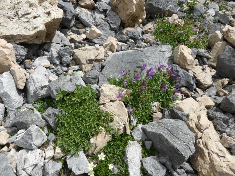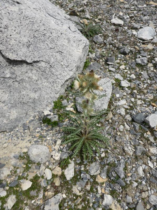 Up and up a steep slope through more talus (our chosen route to get past, actually around, the second headwall)... and tucked in here and there, some plant life: Hooker's Thistle, Cirsium hookerianum; grass-of-parnassus, Parnassia fimbriata, and Arnica sp.;