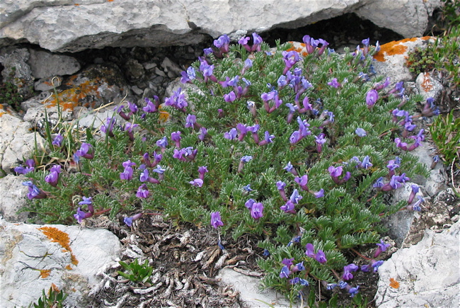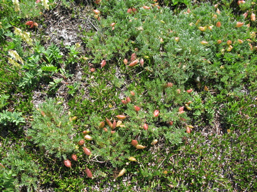 Oxytropis podocarpa is probably one of the most distinctive alpine oxytropis in this area, due to its very finely divided leaves and for its colourful seed pods. Its purple flowers fade attractively to blue. It is quite common and can blanket fairly large areas, in suitable habitat - that being "exposed rocky ridges and turfy alpine hillsides" (Moss & Packer, Flora of Alberta).
