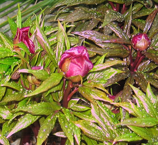 I have several paeonies, mostly started from seed. One of the first to flower is P. mairei, obtained from Glendoick Garden, Scotland (better known for their rhodos). This spring P. mairei is unusual late.