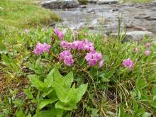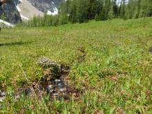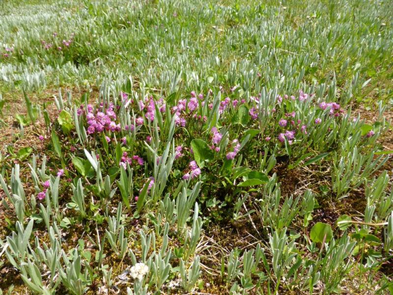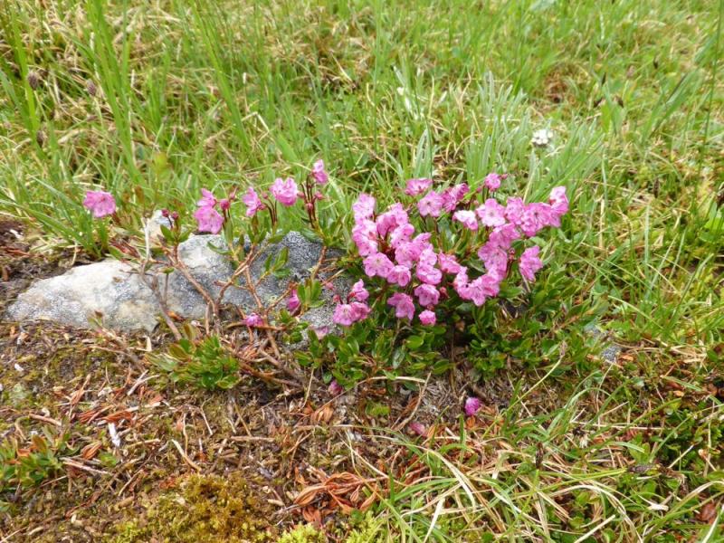Kalmia microphylla was common, dispersed in good number along the boggy lakeshore and streamside, and appearing most spectacular when growing up on a hummocks: