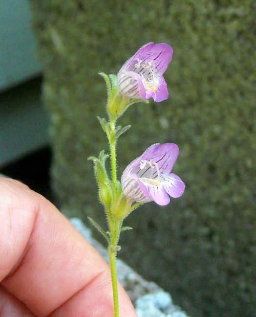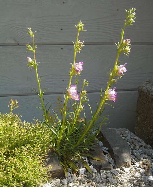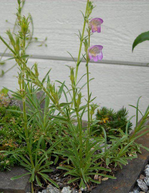 I've been growing this little linear-leaf Penstemon for a few years in a trough, purchased from a New England grower of rock plants. It's not very showy, a few stems with a few tubby violet flowers at a time, never many flowers at once but stretched out over a few weeks. The stems reach about 8" tall. The plant does not match photos I've seen on the USDA site, which I include links for comparison... the leaves on my plant much too narrow compared to USDA photos (see below), and as well, the USDA photos shows flowers spaced much more densely along the stem in congested manner. Any have an idea about what Penstemon species is living in my trough?