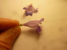 Anthers are exerted (they extend past the flower tube, and are visible when the flower is held in side view, bottom of photo); corolla up to 4 cm (these measure 4 cm):