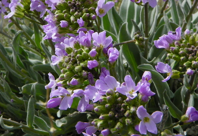 Phoenicaulis cheiranthoides is a dryland pink or violet, perennial Wallflower. It is found on dry rocky hills and ridges in CA, OR, WA, NV, ID and UT. It grows as a mound up to a foot across and about ten inches tall. The gray lance-shaped leaves are four to six inches long, with a short, soft covering of forked hairs. The flower racemes stand vertical to about ten to twelve inches. The seed pods when ripe stand horizontal to the flower stems, giving it it's common name of Dagger Pod.