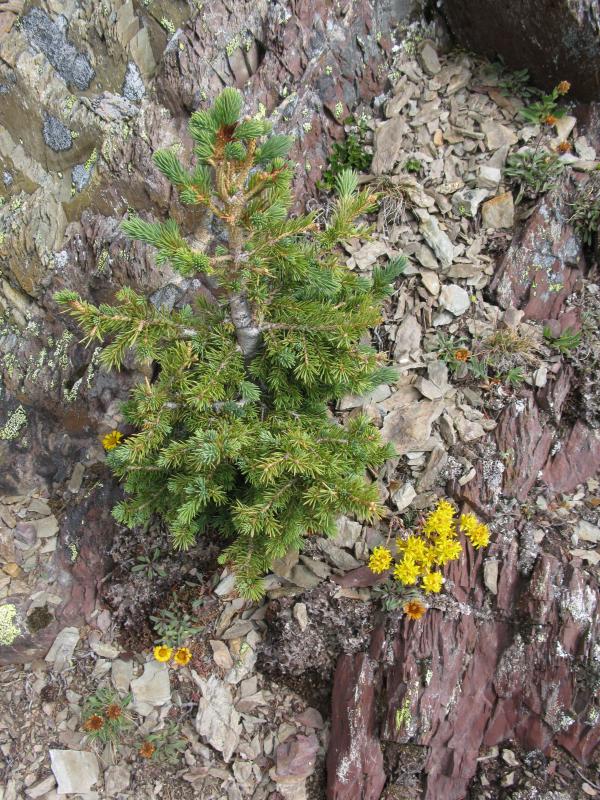 A nice little rock garden in northern Banff N.P. - a small subalpine fir, Abies lasiocarpa, managing to hang on in a sheltered spot above treeline, with Sedum lanceolatum and Erigeron aureus: General Forum