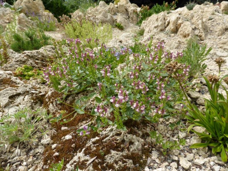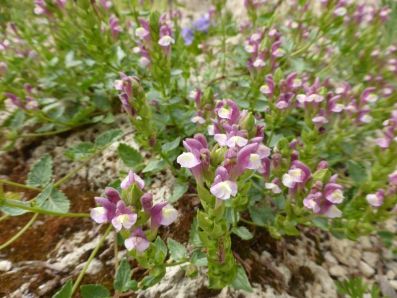 I grew this Scut (mislabelled as Scutellaria tournefortii) from seed in 2011, from an Alplains seed order in 2009. The seeds germinated in 7 days at room temperature, after about 5 weeks of stratification in the cold room. I find that Scutellaria are often a bit big for my smallish rock gardens, but so far, so good with this one. The bi-colour flowers are quite enchanting: