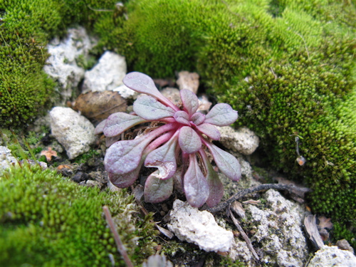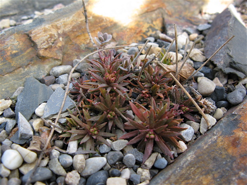 8 ) Flower buds on Androsace carnea alba; Aethionema saxatile in the background; both are evergreen