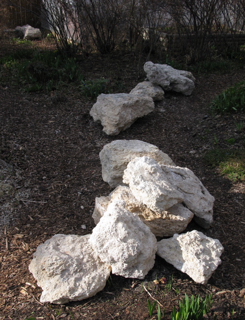 So, tomorrow, we start building the extension to last year's little tufa garden... after our backs rest up from today's efforts, aided hugely by the 2 strong young fellows from the tufa supply company, at unloading the truck! Here is a portion of the raw materials scattered through our yard... a pallet (a ton) of tufa in various sizes, plus 5 massive boulders (several hundred more pounds), and 5 bags of half-inch tufa gravel...