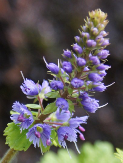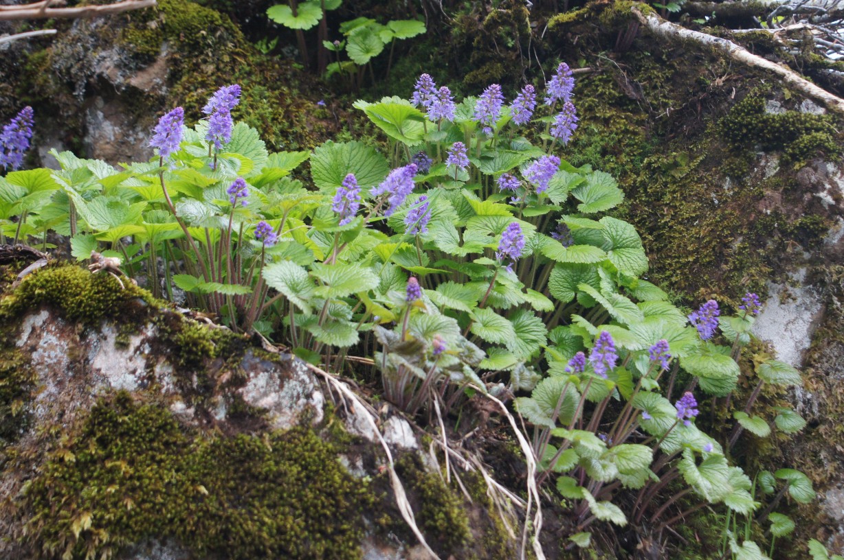 Washington has some nice native species and many obscure ones too. Synthyris schizantha fits into both categories. Its range is from the west slopes of the Olympic Mtns to foothills west of Mt Rainier and south to the Saddle Mtn area of NW Oregon. Where I've seen it growing at mid-elevations in western Olympics, it is abundant growing on thin soils atop boulders, in cool vertical rock walls, or on the forest floor. The flowers are arranged in a cone at the top of a long 6-8 inch stem. The unusual petals are blue with darker blue veins and look tattered or torn, sort of resembling a Soldanella. Leaves are deciduous and can grow as large as 7 inches (20cm) across though 3-4 inches is typical.