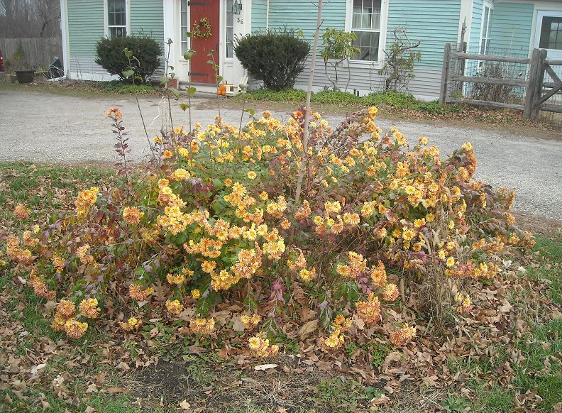 I uploaded a few photos, the first is me after a run a couple days ago, one of the few cold sunny days that reached just above the freezing point by early afternoon; man I love the cool weather. Followed by two photos of a neighbor's super-late-flowering Chrysanthemum, one that doesn't start flowering until November, undeterred by frosts, with lots of orange-yellow blooms (photos 2-3). I must ask my neighbor for a piece; the "mum" has been a stalwart last-bloomer in her garden for the 22 years that I've been here. And photo 4, shows a view of my garden from the street... as I run a 1.25 mile loop around the neighborhood, I do visual botanizing and garden assessment while running; I like the look of the slow-burn of fall color on my epimedium plants as I run by repeatedly.