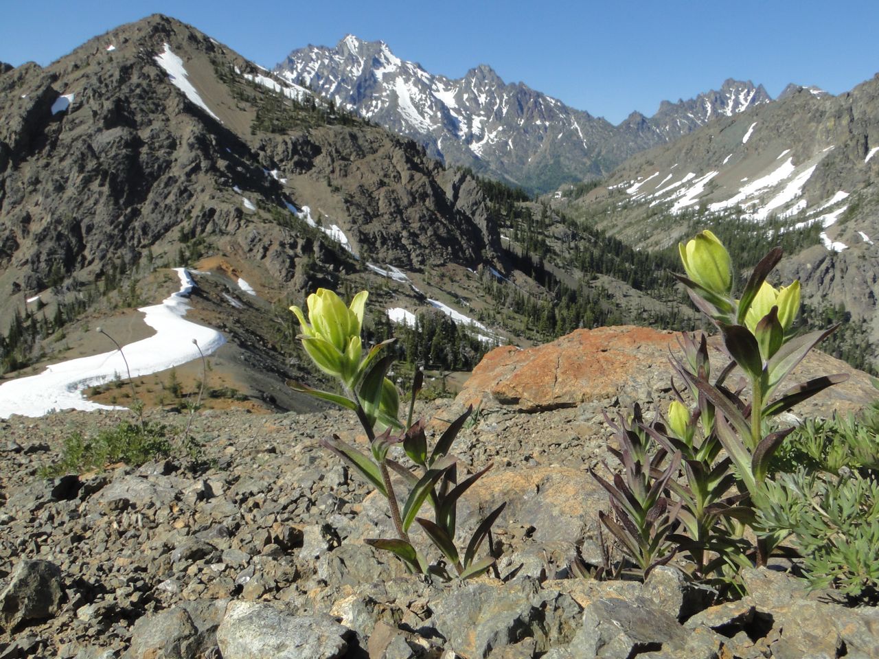 The cool wet weather in the Pacific Northwest this year has delayed snowmelt in the alpine areas. There is so much snow in the North Cascades that the road to Artist's Point near Mount Baker will not be cleared this year. Last weekend we headed down to the Wenatcheee Mountains on the east side of the Cascades hoping to find snow-free alpine areas. We were not disappointed.