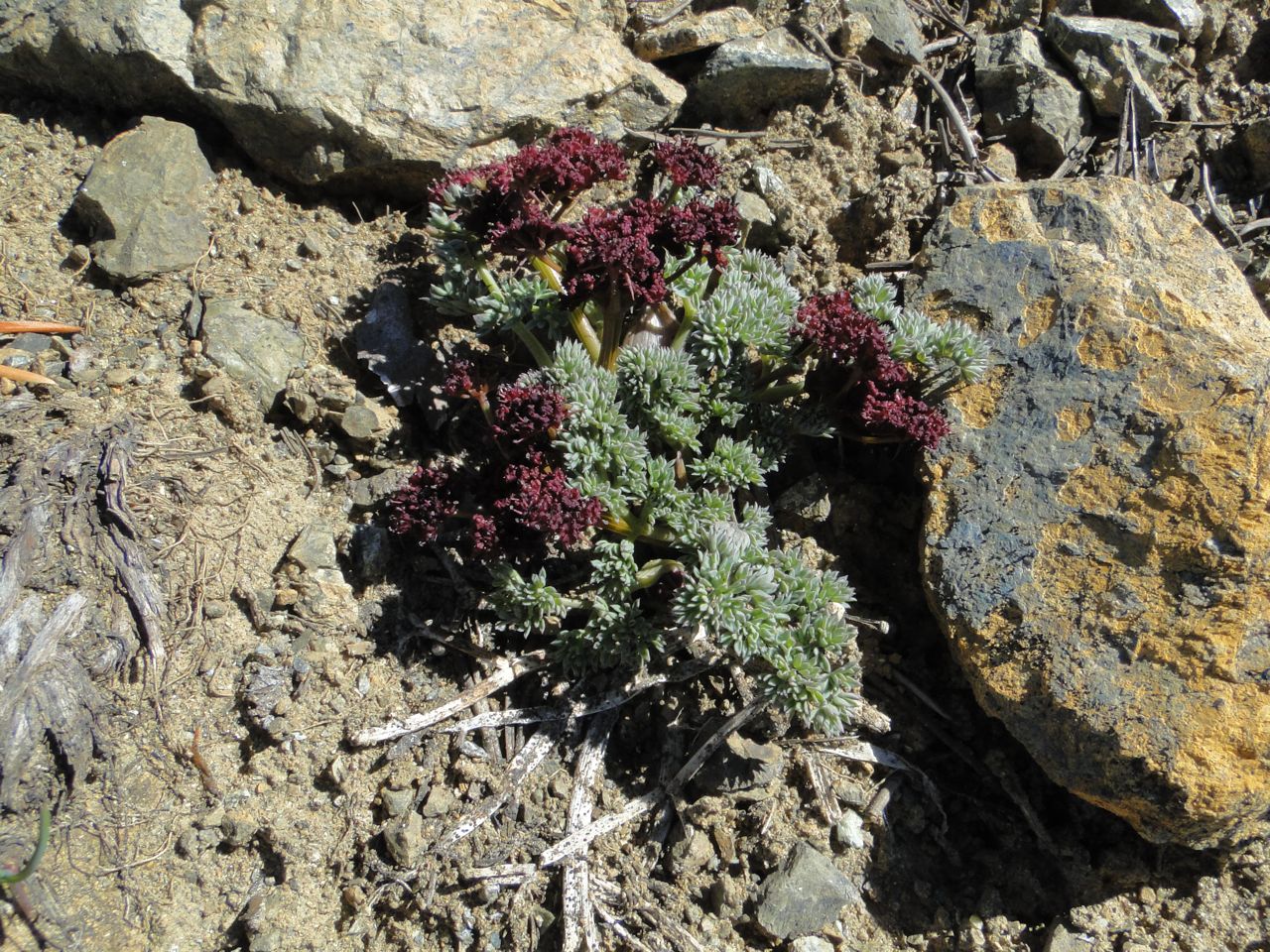 The Claytonia megarhiza v nivalis was spectacular on the summit ridge of Iron Peak and there were even a few Douglasia nivalis still in flower. The Claytonia and Douglasia were dotted around the serpentine scree together with Anenome drummondii , Castilleja elmeri and Ivesia tweedyi. We were fortunate to meet Richard Ramsden on the trail who pointed out some of the other Wenatchee endemics such as Lomatium cuspidatum.