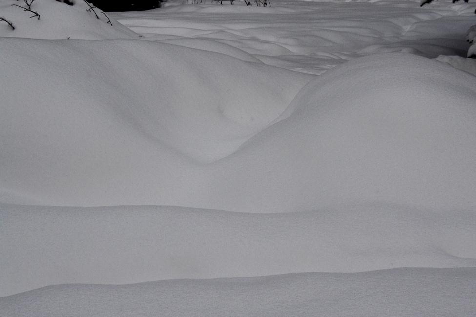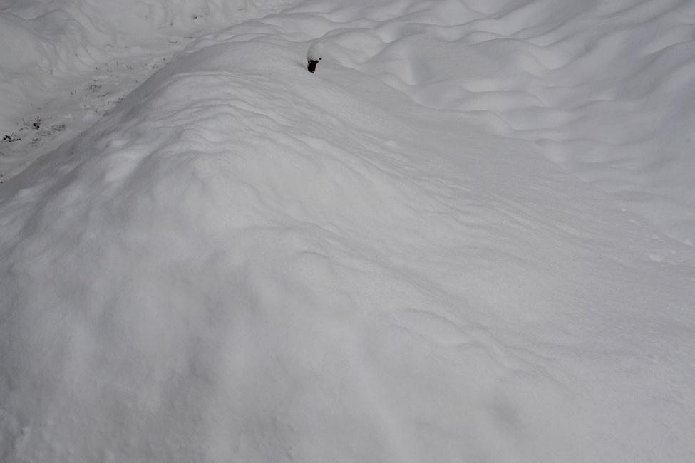 A couple views of some of my garden beds in the last couple of days-- not a whole lot to see! but you see some of the 'ridges' of the rock gardens and berms I've been developing, and looking at them this winter under snow, I've realised that these winter shapes should be taken into account at the design phase, since this is what I see for months at a time!