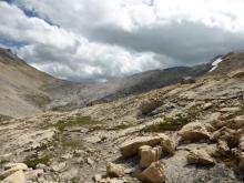 Up and up a steep slope through more talus (our chosen route to get past, actually around, the second headwall)... and tucked in here and there, some plant life: Hooker's Thistle, Cirsium hookerianum; grass-of-parnassus, Parnassia fimbriata, and Arnica sp.;