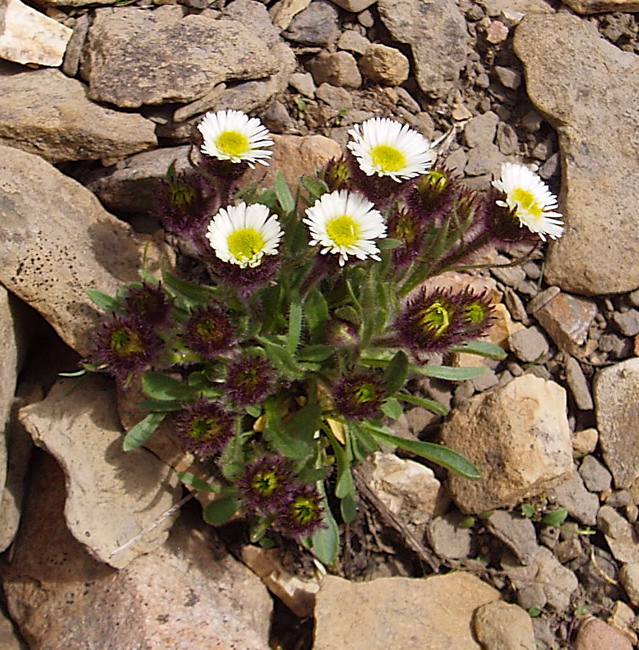 I love coming upon Erigeron humilis on alpine slopes, growing in scree or more stable substrates. Note the spectacularly woolly involucres and the wonderful contrast with the flowers, which are snowy white or sometimes tinged with purple. Now, does this little plant say "alpine" or not?