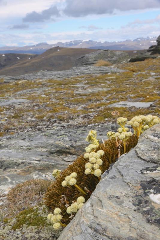 Yellow cushions of Phyllachne rubra and close up.