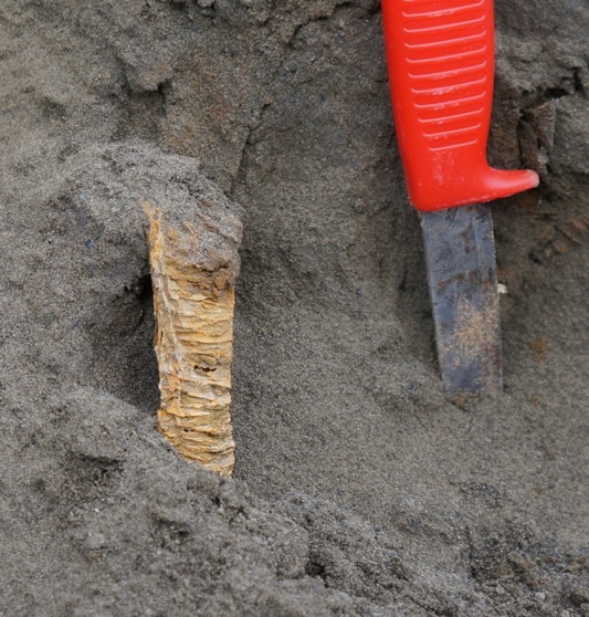Animals living in and on the beach was killed. This clam, Mya truncata, still contained organic material and the siphon is freeze dried.