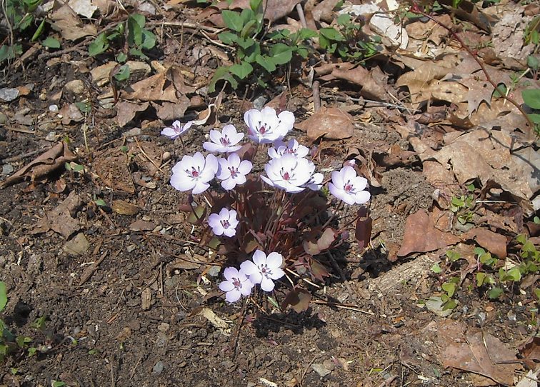 Just starting to flower is Jeffersonia dubia, fun to watch as they emerge, the foliage is beet red and rubbery looking (Photo 1). My plants are from a good dark color form, just opening their first couple blooms... flower color is deeper than what the photo captured. However, I wanted to showcase a form that Darrell Probst collected, CPC 3.10.97 (Cobblewood Plant Collection), selected on account of it's dark flowers (although my normal form are darker) and the red seed pods. In full flower on 04-04-2010, I note some other differences: the ovary is red (green in other dubia forms) and the stamens dark tipped (light color in other dubia forms).