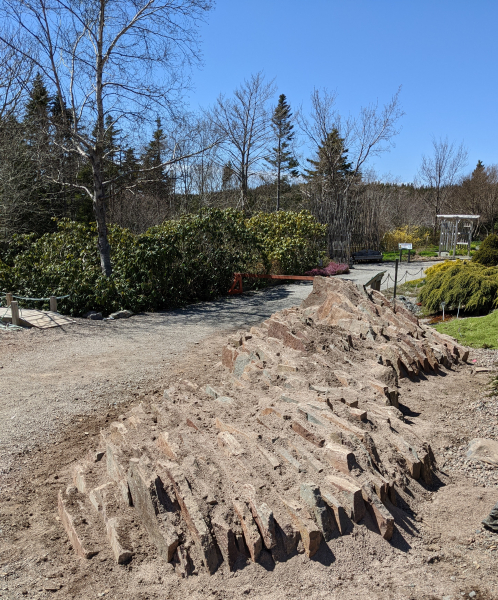 The crevice garden at the Memorial University of Newfoundland Botanical Garden was designed and constructed by Paul Spriggs, co-author of The Crevice Garden. Construction took place in late May 2022 with planting continuing through the growing season of 2022 and 2023. There are well over 200 taxa of plants now installed. The rocks used to construct the garden is red limestone. As a result, most of the plants being grown here are calcifiles.